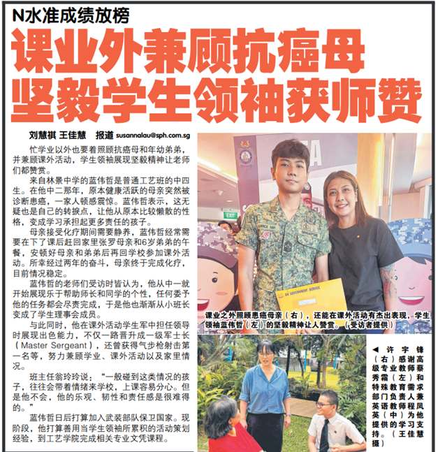 Despite his mum's battle with cancer, he shines bright with his leadership role in NCC, performing on stage for Woodgrove's Got Talent, and challenging himself academically by taking subjects at a higher level. At the same time, he juggles family responsibilities, school, and passions with a smile - he's a true inspiration!